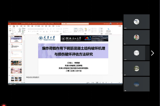 会上,师燕超教授首先结合丰富详实的例证数据,从科学问题凝练、研究任务明确、研究内容制定三个方面,对国内外爆炸荷载作用下钢筋混凝土结构破坏机理与损伤破坏评估方法的研究背景进行了介绍。随后,师教授细致阐述了钢筋混凝土结构破坏及连续倒塌高效分析方法、钢筋混凝土结构损伤机理与连续倒塌机制、钢筋混凝土结构损伤破坏评估方法等内容,并结合团队研究的最新成果,对当前爆炸荷载作用下钢筋混凝土结构损伤研究的关键问题和前瞻性研判提出了独到见解。最后,师教授与参会的广大专家学者、师生们进行了热烈而富有成效的互动交流。