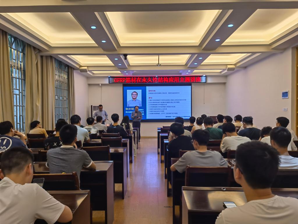 钟庆明经理多年从事纤维复合材料在建筑工程应用和钢筋机械连接技术的研究,参与了压水堆核电站防飞机撞击机械接头施工技术规程、纤维增强复合材料箍筋标准、纤维增强复合材料筋混凝土桥梁技术标准、钢筋机械连接接头认证标准、钢筋机械连接技术规程、玻璃纤维增强筋(GFRP)组合锚杆技术规程。此次讲座结首先以传统建筑钢筋为切入点,从材料特性、制作工艺方面对玻璃纤维增强聚合物筋材进行介绍,并结合实际工程应用中不同场景和具体典型案例,生动、全面、具体地介绍了GFRP筋材对比其他筋材的优势。最后基于国际、国内GFRP应用和发展进行总结,并对未来的发展方向提出了独到的见解。讲座结束后,钟庆明经理在提问互动环节围绕讲座主题与大家进行了热烈而富有成效的交流互动。讲座内容精彩丰富,不仅拓宽了同学们的思路,还增长了同学们的见识,到场师生们受益匪浅。