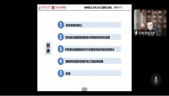 应太阳成集团122ccvip邀请,7月1日上午,同济大学王伟教授做客我校“漓江讲坛”,为广大师生开展了题目为“钢结构抗震韧性提升新技术及工程应用”的学术报告。