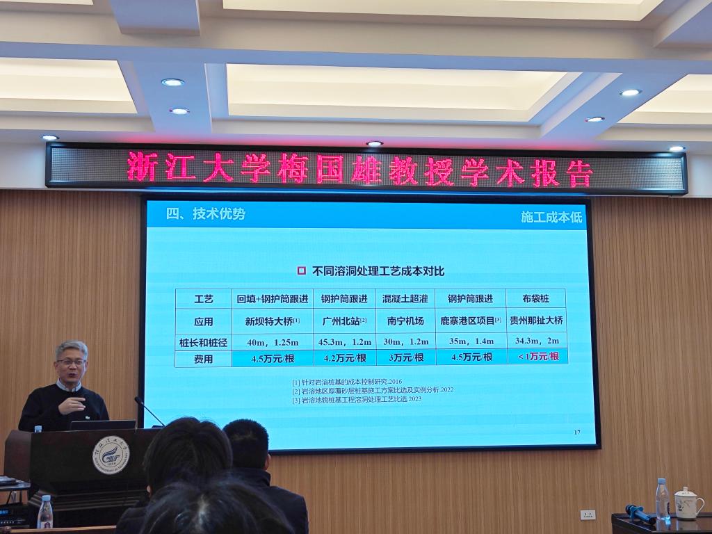 3月19日上午,浙江大学梅国雄教授做客太阳成集团122ccvip“漓江讲坛”,在我校屏风校区四栋4204会议室为广大师生开展了题目为“复杂环境岩溶地区布袋桩技术研究新进展”的学术讲座。讲座由钱凯院长主持。